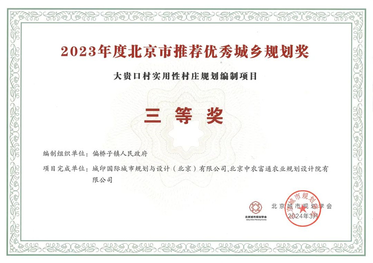 近日,由北京中農富通農業規劃設計院有限公司與城印國際城市規劃與設計(北京)有限公司聯合編制的大貴口村實用性村莊規劃編制項目,榮獲了2023年度北京市推薦優秀城鄉......
