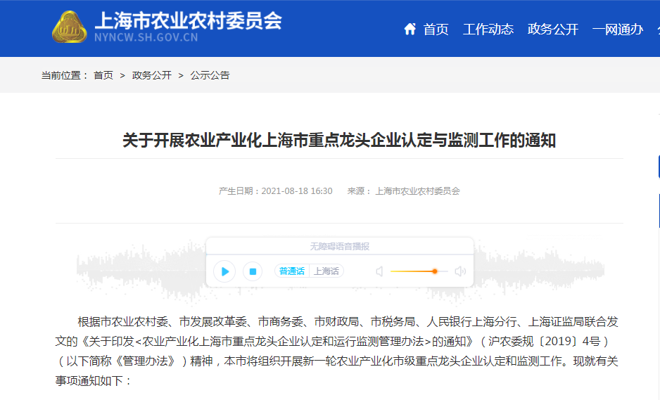 根據(jù)市農(nóng)業(yè)農(nóng)村委、市發(fā)展改革委、市商務(wù)委、市財政局、市稅務(wù)局、人民銀行上海分行、上海證監(jiān)局聯(lián)合發(fā)文的《關(guān)于印發(fā)<農(nóng)業(yè)產(chǎn)業(yè)化上海市重點龍頭企業(yè)認定和運行監(jiān)測......