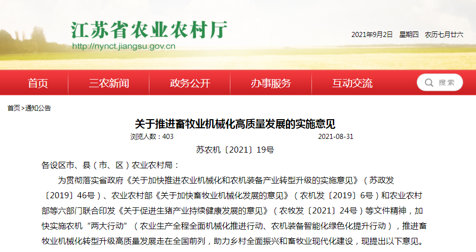 各設(shè)區(qū)市、縣(市、區(qū))農(nóng)業(yè)農(nóng)村局:為貫徹落實省政府《關(guān)于加快推進農(nóng)業(yè)機械化和農(nóng)機裝備產(chǎn)業(yè)轉(zhuǎn)型升級的實施意見》(蘇政發(fā)〔2019〕46號)、農(nóng)業(yè)農(nóng)村部《關(guān)于加快畜......