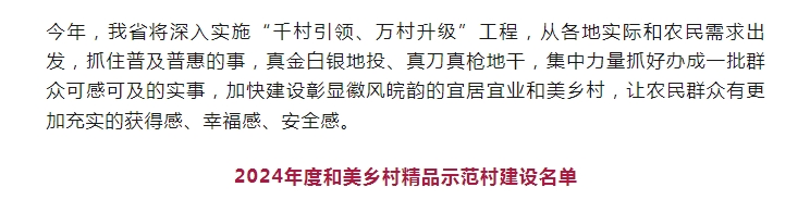 2024年度安徽省和美鄉村省級中心村建設名單已印發,共有850個中心村入選,建設周期18個月。加快建設彰顯徽風皖韻的宜居宜業和美鄉村,是推進安徽農業農村現代化的......