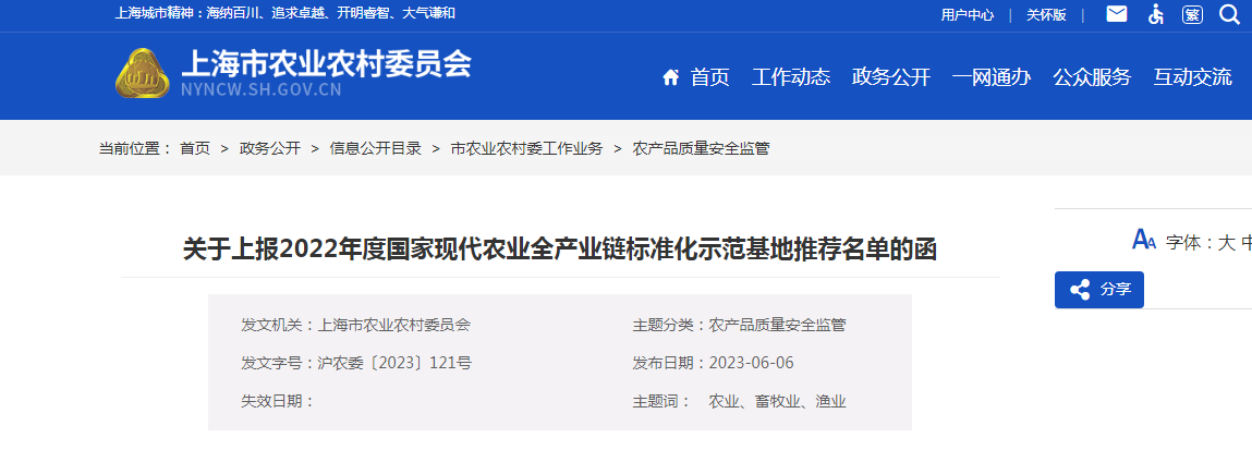 農業農村部農產品質量安全監管司:根據《農業農村部關于開展國家現代農業全產業鏈標準化示范基地創建的通知》(農質發〔2022〕4號)、《關于做好 2022 年國家現......
