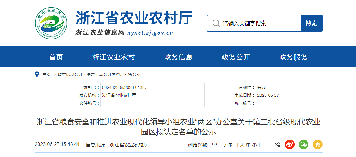 根據《浙江省現代農業園區、特色農業強鎮驗收辦法(試行)》和《關于開展第三批省級現代農業園區驗收工作的通知》要求,經省糧食安全和推進農業現代化領導小組農業“兩區”......