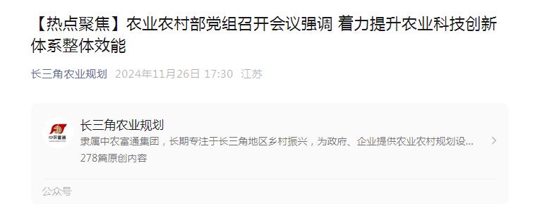 11月25日,農(nóng)業(yè)農(nóng)村部黨組書記、部長(zhǎng)韓俊主持召開部黨組會(huì)議,審議并原則通過《關(guān)于加快提升農(nóng)業(yè)科技創(chuàng)新體系整體效能的實(shí)施意見》。會(huì)議強(qiáng)調(diào),要深入學(xué)習(xí)貫徹習(xí)近平總......