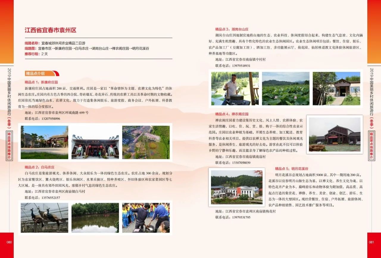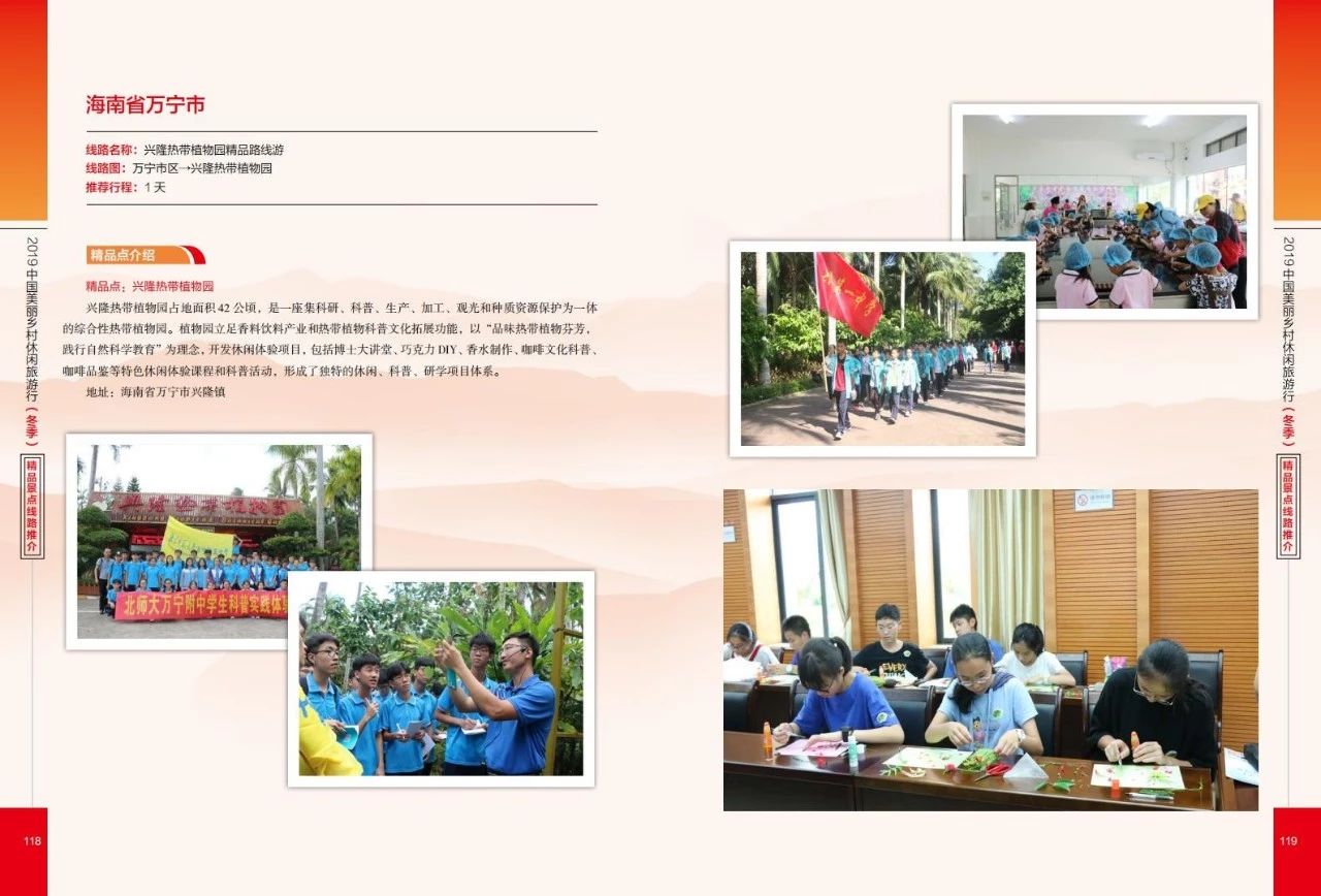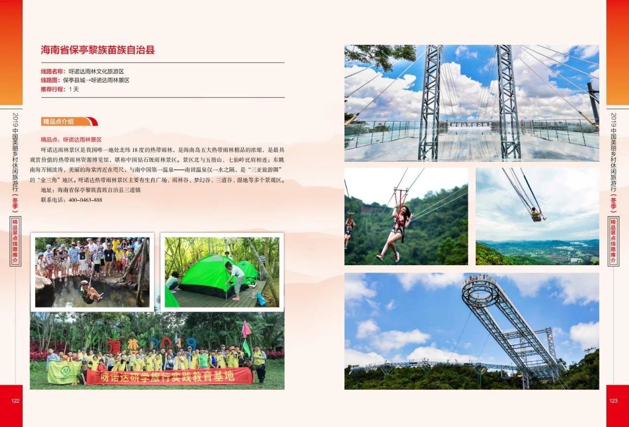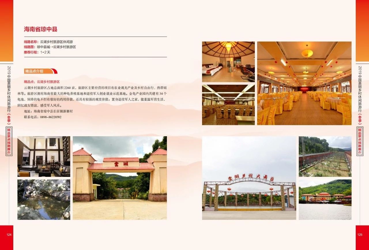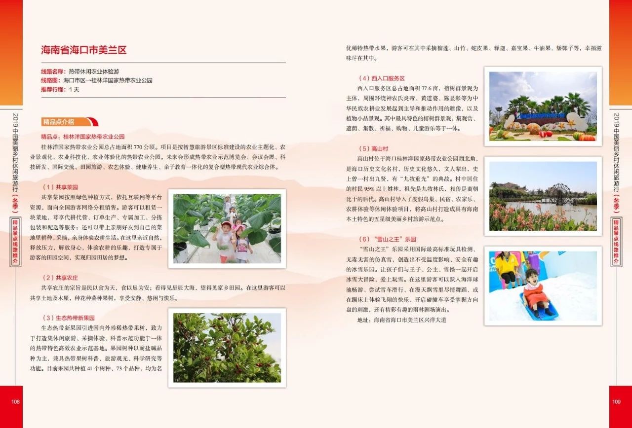 12月24日,2019中國美麗鄉村休閑旅游行(冬季)推介活動在海南省瓊海市博鰲鎮舉辦,發布休閑農業和鄉村旅游冬季精品旅游線路100條、景點273個。這是農業農村部鄉村休閑旅游“春觀花”“夏納涼”“秋采摘”“冬農趣”系列推介活動中的冬季主題活動。至此,2019年四季活動共推介線路410條、景點1300個,精品景點線路37條。
