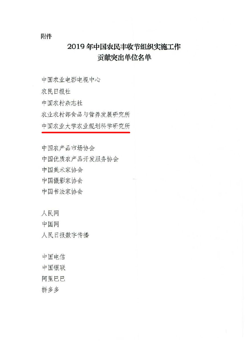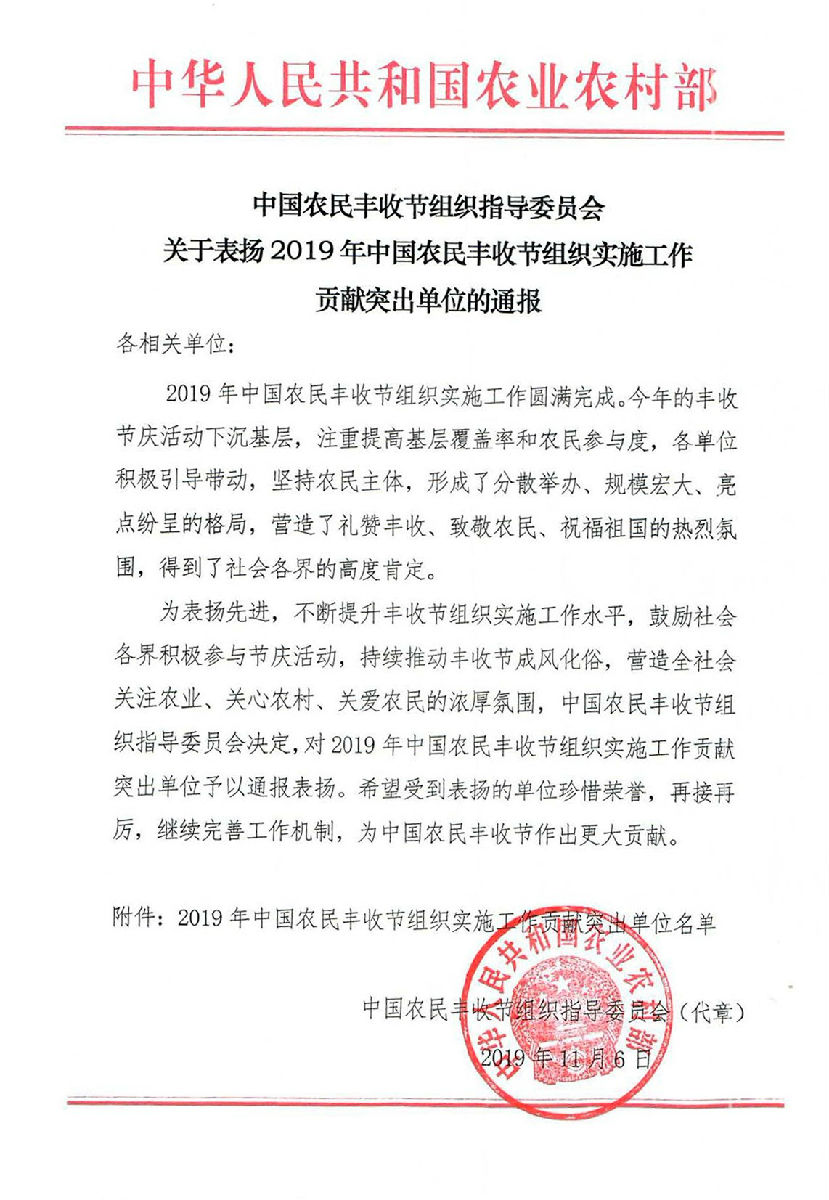 圖:由農業農村部牽頭組織成立的中國農民豐收節組織指導委員會,對中國農業大學農業規劃科學研究所、中國銀聯等2019年豐收節期間貢獻突出單位予以表彰