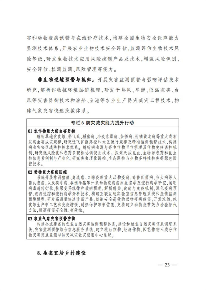 《規劃》顯示,把高水平農業科技自立自強作為農業農村發展的戰略支撐,聚焦基礎前沿熱點、關鍵核心技術卡點、產業發展升級痛點及鄉村建設發展重點,特別是突出品種、地力、農機、植保、防災等關鍵環節和生物育種、基因編輯、黑土地、鹽堿地、大豆、油菜、生物安全等重點領域,挖掘糧食作物增產潛力,確保國家糧食安全,支撐引領農業高質量發展和鄉村全面振興。
