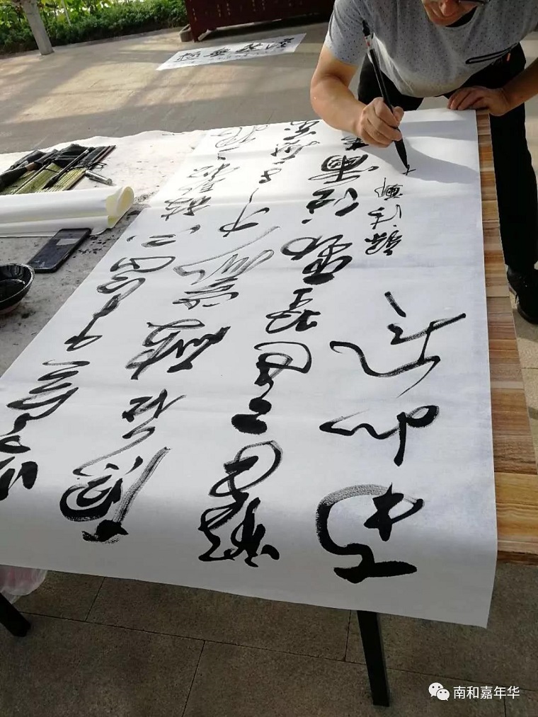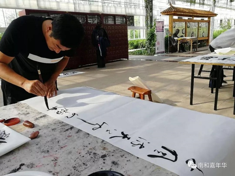 開幕式后,領導一行視察書法筆會。在筆會現場,南和書畫家們揮毫潑墨,爭相獻藝,用飽蘸濃墨的筆觸表達著對生活的熱愛和對佳節的祝福。一幅幅精美作品贏得觀眾的嘖嘖稱贊。前來參觀的書畫愛好者們也相互交流,場面氣氛十分熱烈。