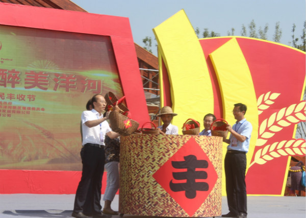 來(lái)自洋河當(dāng)?shù)氐膬晌晦r(nóng)民代表王慶豐和劉紅俠,站在舞臺(tái)中央,和洋河新區(qū)黨委書記張聯(lián)東、中國(guó)農(nóng)業(yè)大學(xué)農(nóng)業(yè)規(guī)劃科學(xué)研究所所長(zhǎng)張?zhí)熘淌冢约爸袊?guó)農(nóng)業(yè)大學(xué)國(guó)際學(xué)院原院長(zhǎng)孟繁錫等專家、領(lǐng)導(dǎo)、嘉賓一道,共同將篩里的糧食倒?jié)M糧倉(cāng),現(xiàn)場(chǎng)的觀眾發(fā)出“豐收大吉”的歡呼聲響徹全場(chǎng)。