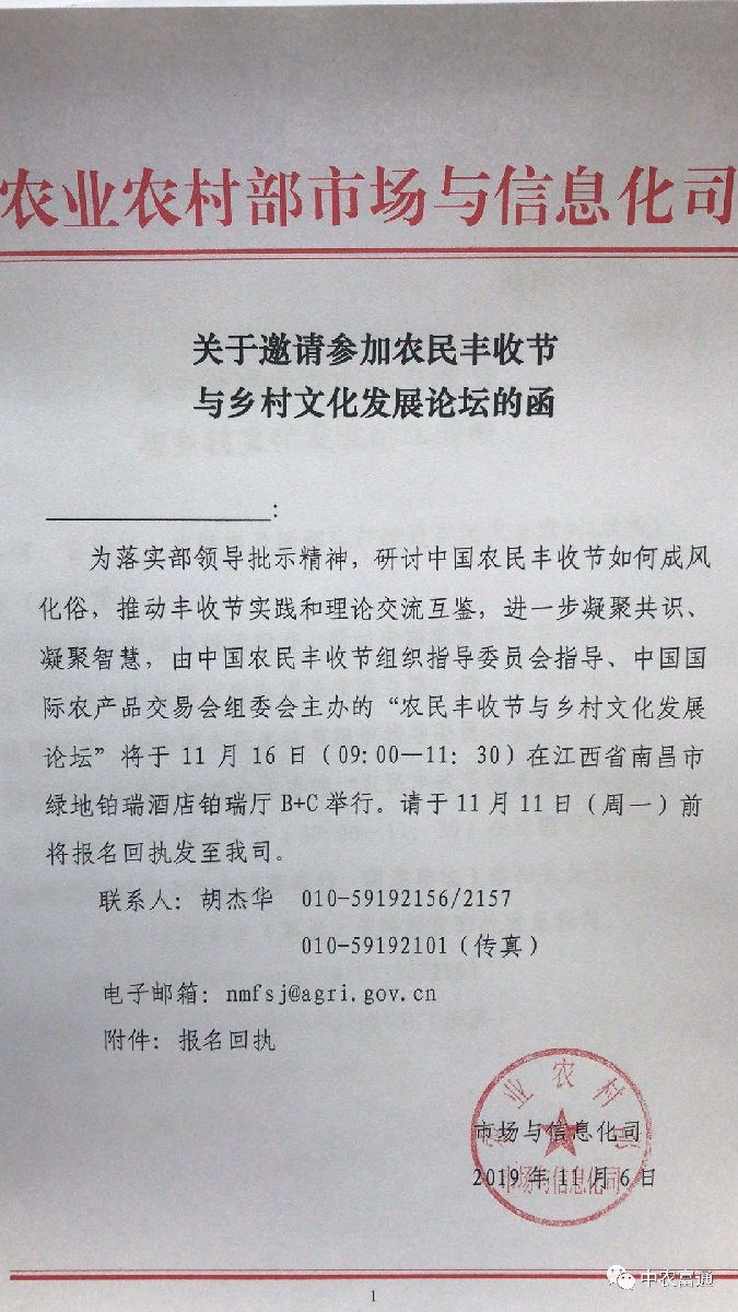▼由中國農民豐收節組織指導委員會指導,第十七屆中國國際農產品交易會組委會主辦,江西省南昌市人民政府與中國農業大學農業規劃科學研究所承辦的“春華秋實話嘉年”農民豐收節與鄉村文化發展論壇籌備工作進展順利,將于2019年11月16日 09:00-11:30在江西·南昌 綠地鉑瑞酒店鉑瑞廳B+C舉行,誠邀您的參加!