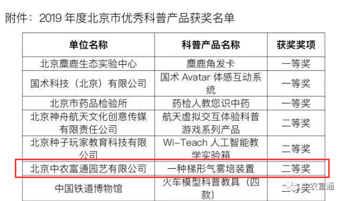 ▼11月7日,北京科普基地聯盟組織的“2019年度北京市優秀科普產品評選”結果公示,中農富通示范基地——北京國際都市農業科技園提交的“一種梯形氣霧培裝置”獲北京市優秀科普產品二等獎,“循環農業-食用菌體驗課程”獲北京市優秀科普課程三等獎和網絡人氣獎。