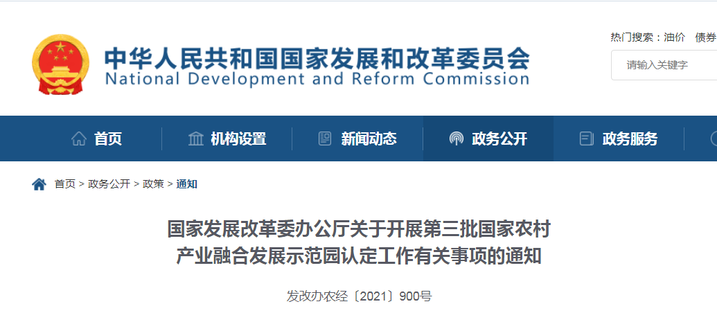 各省、自治區、直轄市及計劃單列市、新疆生產建設兵團發展改革委按照《國家農村產業融合發展示范園創建工作方案》《國家農村產業融合發展示范園認定管理辦法(試行)》要求......