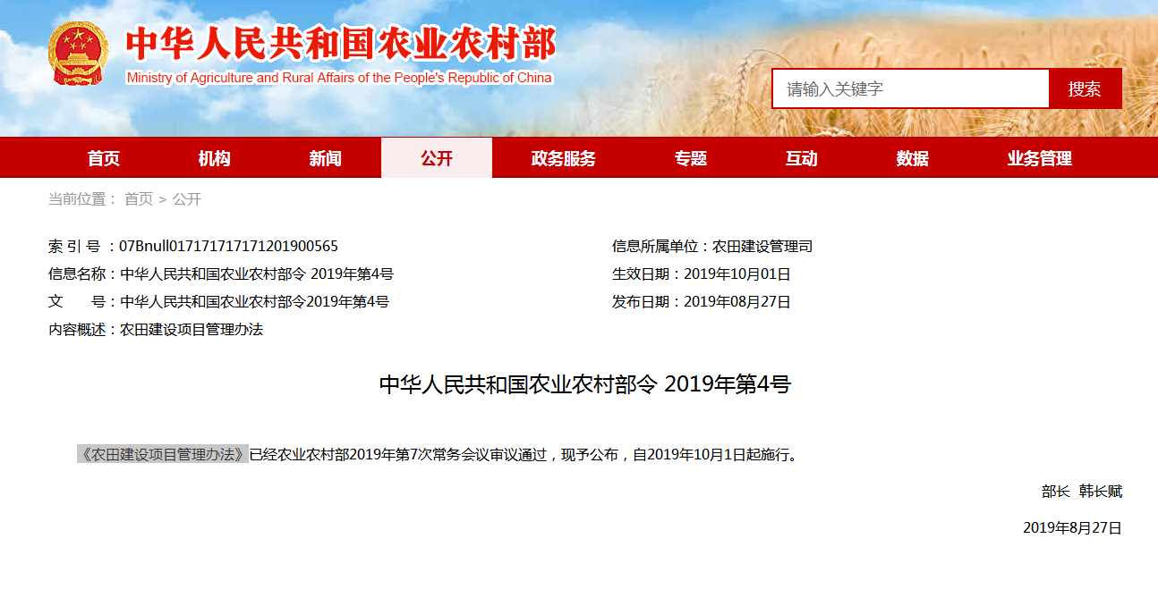《農(nóng)田建設(shè)項(xiàng)目管理辦法》已經(jīng)農(nóng)業(yè)農(nóng)村部2019年第7次常務(wù)會(huì)議審議通過(guò),現(xiàn)予公布,自2019年10月1日起施行。 ...